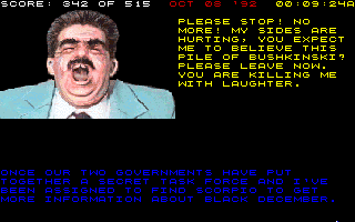 Given we dont even leave the state, let alone the country to do so, Im including Scorpios short piece. Hes quite condescending, telling you how hes amazed that youve even made it as far as you have. Hes open that hes a member of the KGB now, and asks for your promise of silence on the matter. He doesnt actually offer anything particularly groundbreaking at this point, but he does make it rather clear that hes not the Jackal in disguise. Hes also a well-thought character, making this more or less three for three – but that doesnt forgive the sheer amount of caricatures that have existed up until this point. If anything is to be taken, just the following conversation should really do as an example of this game at its best: